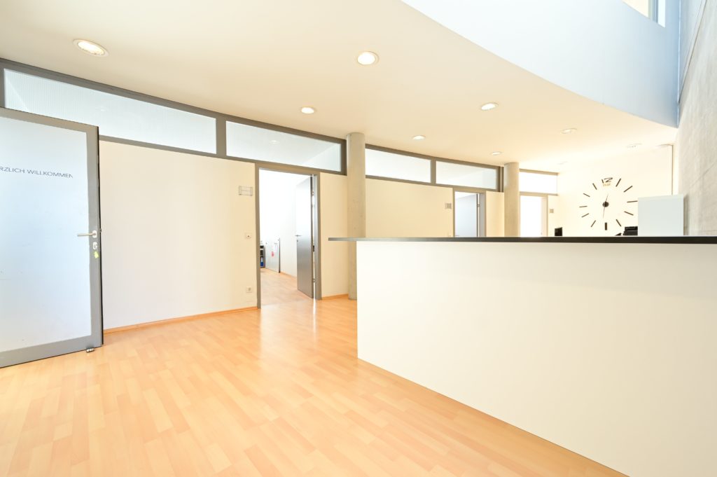 Professioneller Empfangsbereich, 3 Büros je 26 m². 1 weiteres Büro, Flur, 2 WC's mit Vorraum.