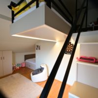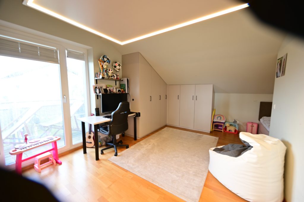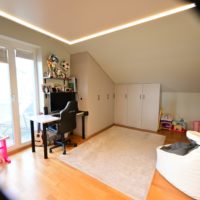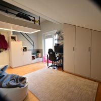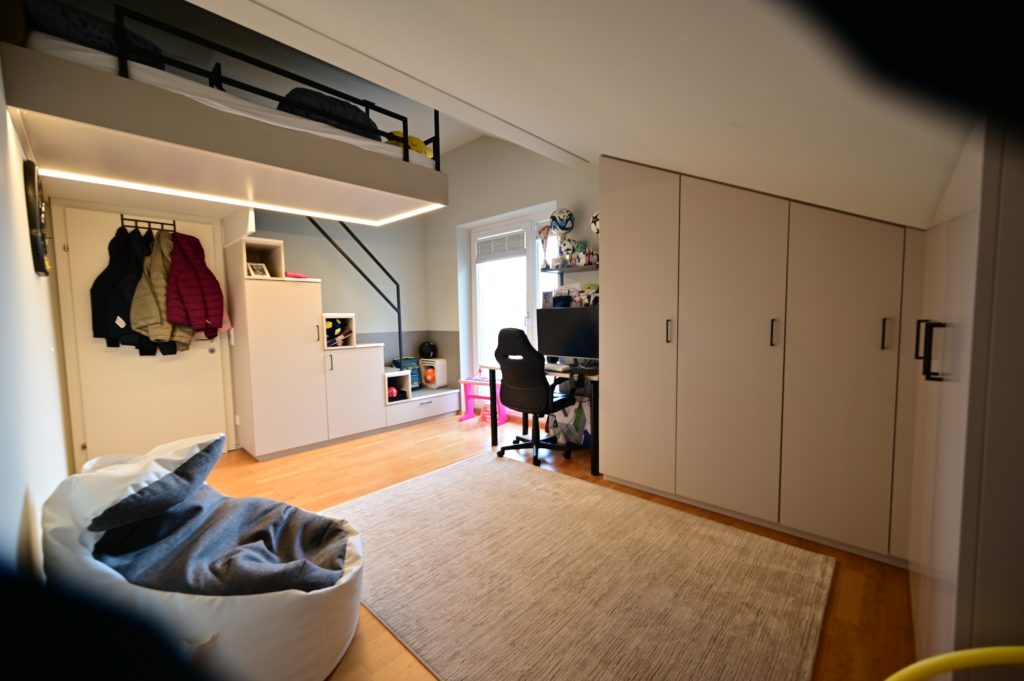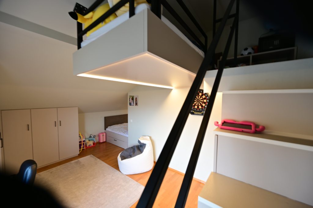 integriert und fügt sich perfekt in das Gesamtbild ein. Ein maßgefertigter Kinderzimmerverbau mit zwei Betten, Treppe und Einbauschrank bietet durchdachten Stauraum und vielseitige Nutzungsmöglichkeiten.
