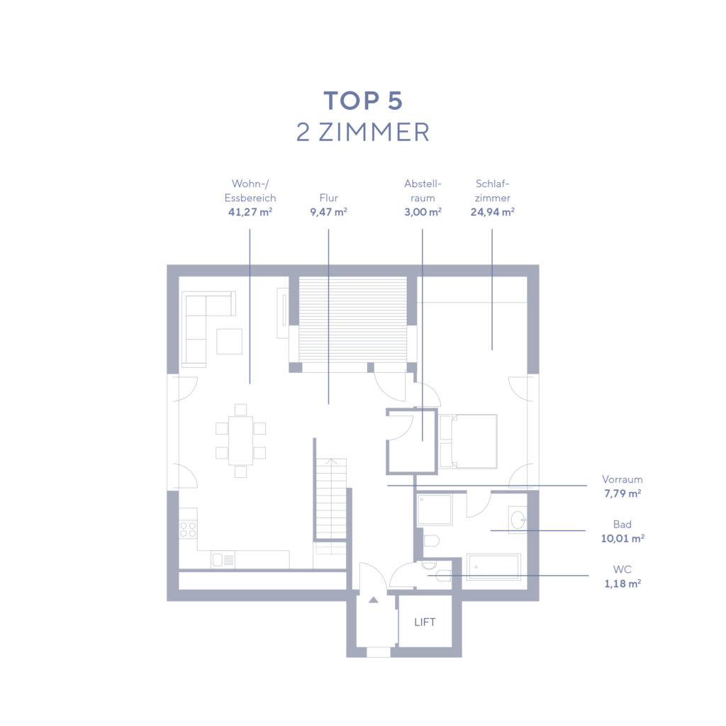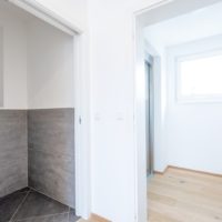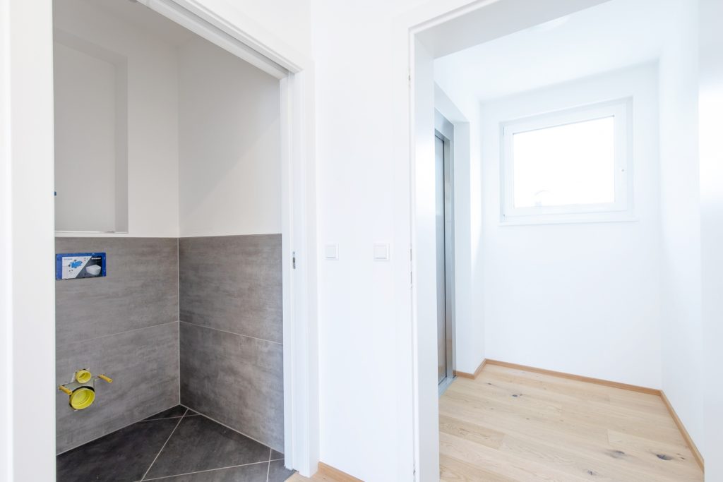 Aufzug direkt in die Wohnung, Vorraum, WC, großzügiger Wohn-/Essbereich mit offener Küche, uneinsichtige Terrasse, Schlafzimmer mit angrezendem Badezimmer.