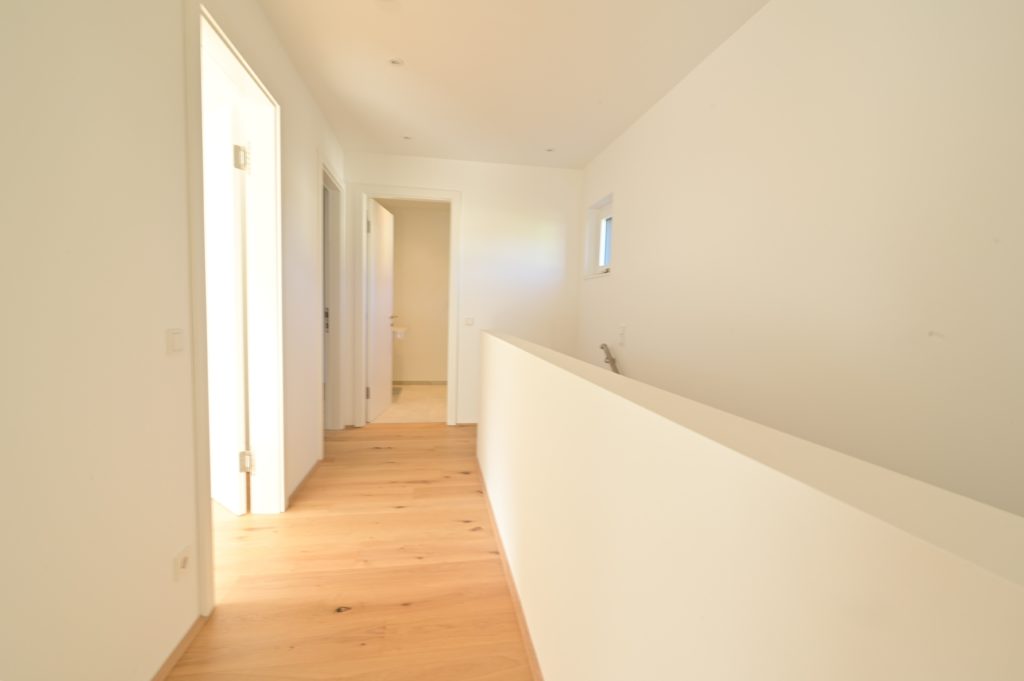 OG: Flur, Duschbad mit WC, 2 Schlafzimmer + Elternschlafzimmer mit Ankleide und Ensuite-Bad mit Dusche, Wanne & WC, Dachterrasse.