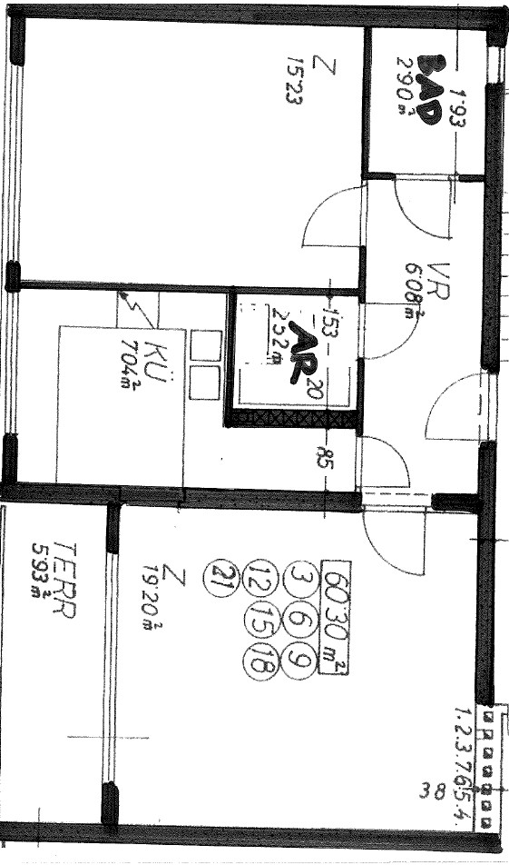 Vorraum, Wohnzimmer mit Ausgang auf Loggia, Küche, Abstellraum, Schlafzimmer, Bad mit Fenster.