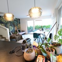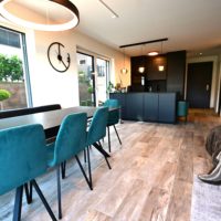 EG: Vorraum/Garderobe, WC, offener Wohn-/Essbereich mit integrierter Küche, Ausgang auf Terrasse und Garten.