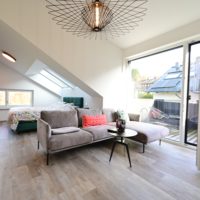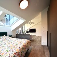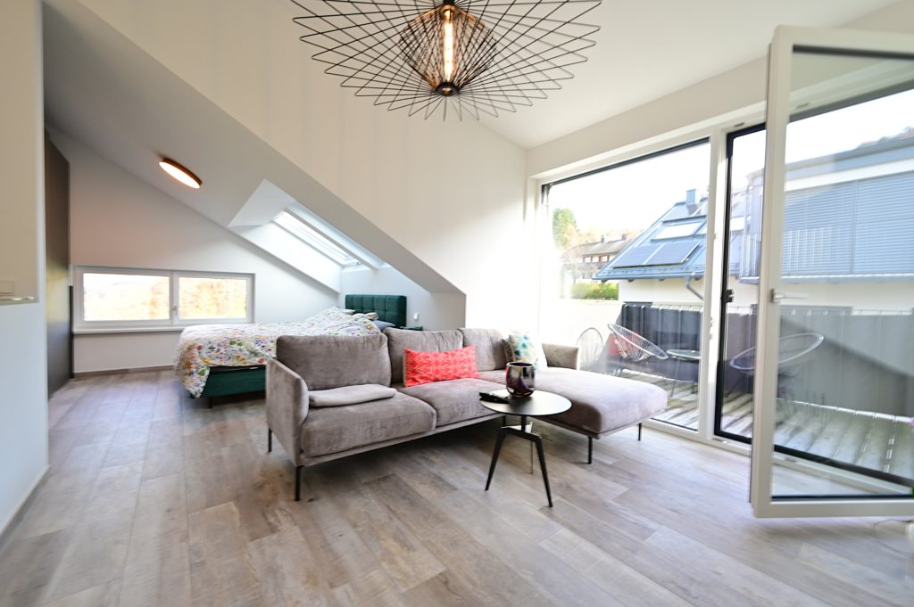 DG: Offener Wohn-/Schlafraum mit Ausgang auf Balkon, Schlafzimmer, Bad mit Wanne, Dusche und WC.