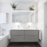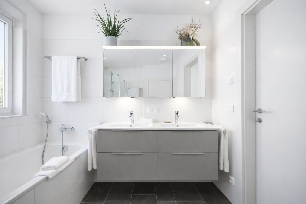 Vorraum, Gäste-WC, Bad mit Wanne, Regendusche und WC, Doppelwaschtisch von Villeroy & Bosch, mit Unterschrank und Spiegelschrank, 1 Schlafzimmer mit eigenem Zugang auf die Terrasse, 2 helle Schlafzimmer, Wohn/Koch/Essbereich mit Terrassenzugang.