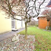 Vorraum mit Einbauschränken, Bad mit Wanne und Dusche, WC, Schrankraum mit angeschlossenem Schlafzimmer, Schlafzimmer, Wohn-/Essbereich mit integrierter Einbauküche, Terrasse, Garten.